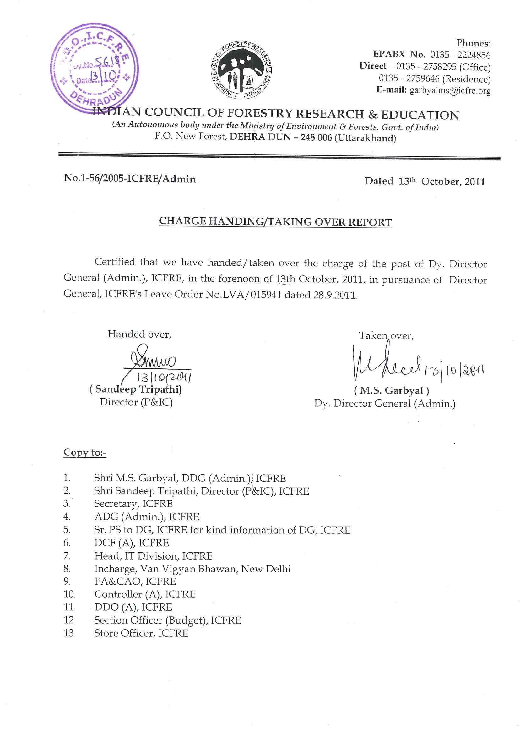 Report of Charge Handing / Taking Over for the Post of DDG (Admin), ICFRE Dated: 13.10.2011