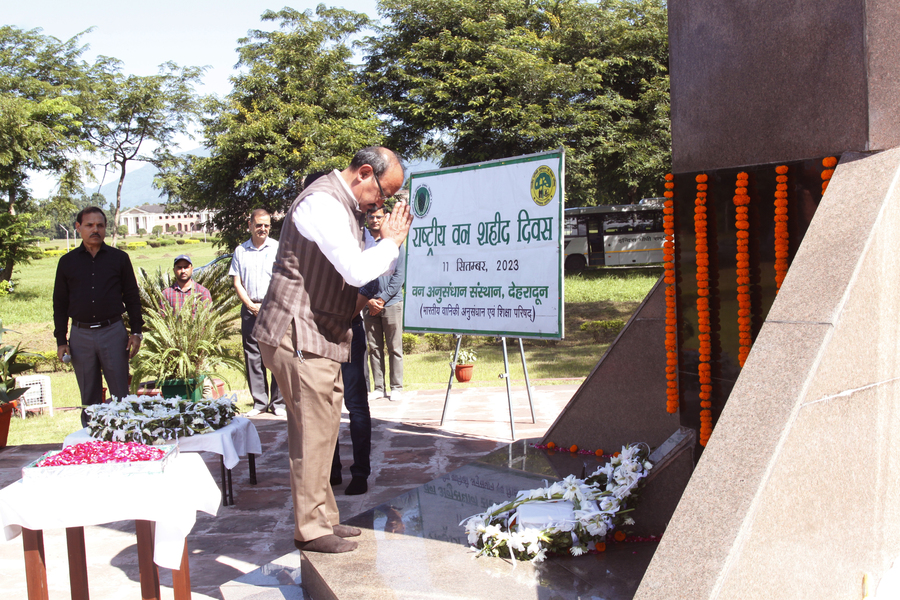 Hon'ble Minister of MoEF&CC Shri Bhupender Yadav paid floral tribute to forest martyrs at Forest Memorial, Forest Research Institute, Dehradun on 29th April, 2022